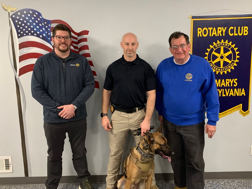 Recently the St. Marys Rotary Club funded the purchase of a Kennel for the City of St. Marys Police Department's K9 Police Dog Draco. Pictured is Chief Mike Shaffer, and Draco, along with Rotarian Bob Roberts, and Club President Josh Hanes. Also the club extends congratulations and many best wishes to Chief Mike Shaffer in his new position as Chief of Police!